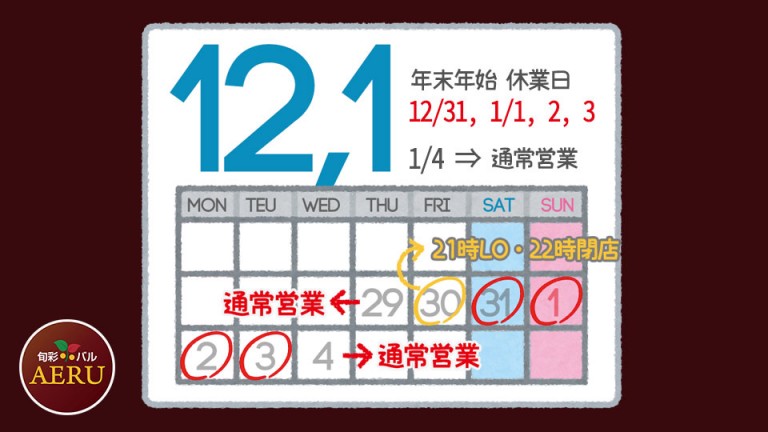 いつも旬彩バルAERUをご愛顧いただきまして、ありがとうございます。